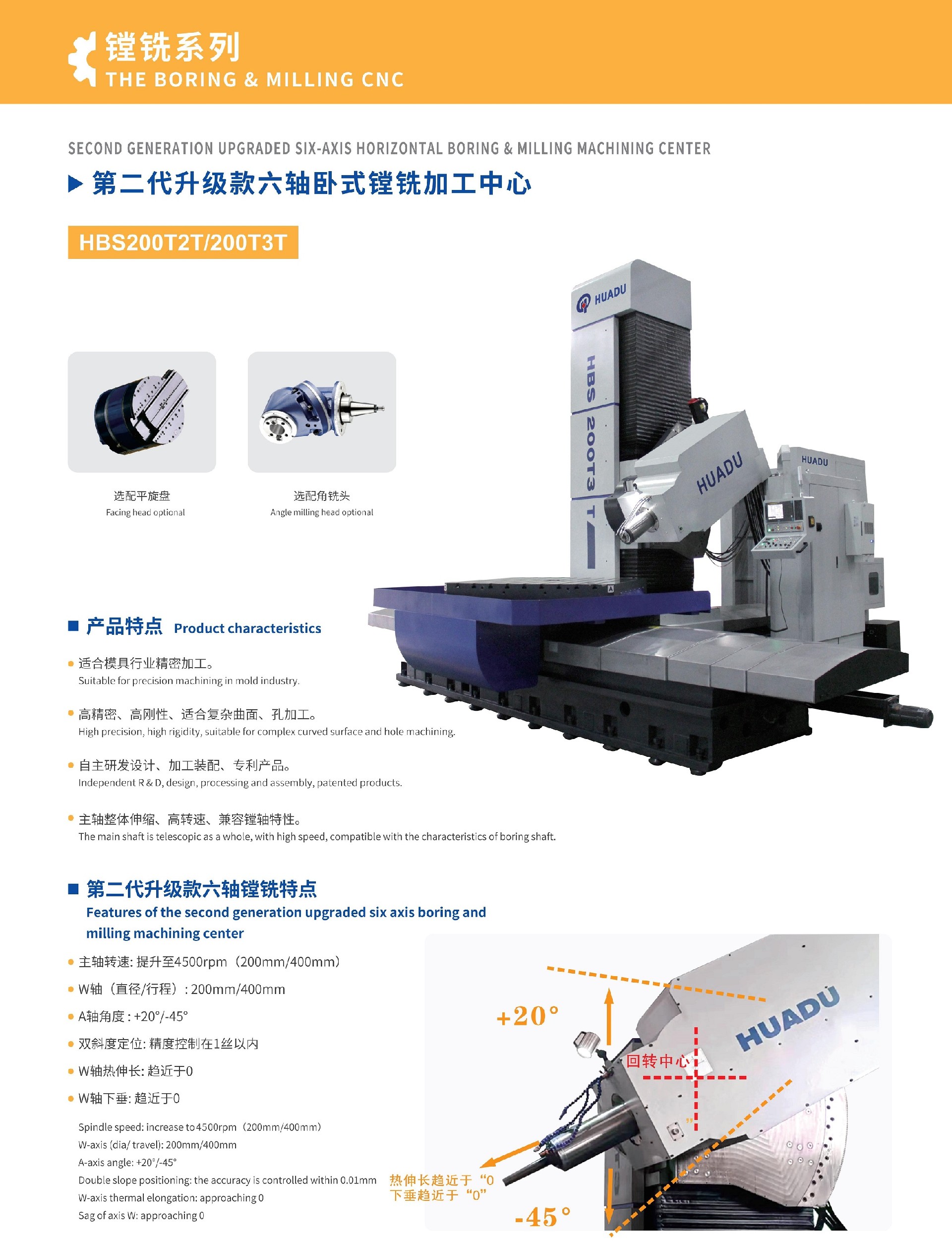 適合模具行業精密加工;高精密、高剛性、適合復雜曲面、孔加工;自主研發設計、加工裝配、專利產品;主軸整體伸縮,高轉速,兼容鏜軸特性;第二代升級款六軸鏜銑特點:主軸轉速:提升至5000rpm(200mm/400mm)W軸(直徑/行程):200mm/400mmA軸角度:+20°/-45°雙斜度定位:精度控制在1絲以內 W軸熱伸長:趨近于0 W軸下垂:趨近于0